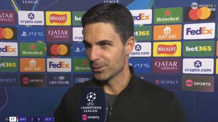 欧冠联赛第二轮,阿森纳在主场以2-0战胜奥林匹亚科斯。赛后,球队主教练阿尔特塔接受了TNT体育的采访。他评价了厄德高和全队的发挥,表示对胜利及零封对手的结果感到满意。
